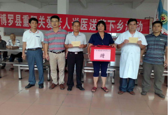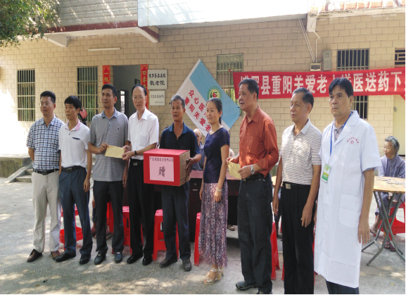 2015年10月19日,博羅縣重陽節(jié)關(guān)愛老年活動啟動儀式在博羅縣中醫(yī)醫(yī)院舉行,本次活動由縣老齡委、民政局、衛(wèi)計局、縣老年醫(yī)療衛(wèi)生協(xié)會、縣紅十字會主辦,縣中醫(yī)醫(yī)院承辦,博羅彭城慈善會、廣東穗康醫(yī)藥有限公司、博羅康佳、羅浮山黃龍宮太上丹道養(yǎng)生試范基地協(xié)辦。出席本次活動的領(lǐng)導(dǎo)和嘉賓為:博羅縣原人大主任蔡民壽、博羅縣原政協(xié)副主席兼統(tǒng)戰(zhàn)部長劉細(xì)雅、博羅縣老年醫(yī)療衛(wèi)生協(xié)會會長陳勝如、博羅康佳董事長曹巨潮及舉辦單位單位相關(guān)負(fù)責(zé)人。儀式結(jié)束后,舉辦單位相關(guān)領(lǐng)導(dǎo)帶領(lǐng)眾心醫(yī)療團(tuán)隊到博羅縣羅陽鎮(zhèn)田牌敬老院舉行慰問及送醫(yī)送藥義診活動。 本次活動到10月30日圓滿結(jié)束,共慰問9個鄉(xiāng)鎮(zhèn)敬老院老人,總?cè)藬?shù)157人,送去醫(yī)療器械一批(電子血壓計、電子探熱針、老人護(hù)理包)和慰問金,為老人進(jìn)行健康檢查和建立健康檔案,并進(jìn)行義診送醫(yī)送藥活動。活動取得了圓滿成功,受到當(dāng)?shù)卣⒕蠢显豪先思叭罕姷囊恢潞迷u。本次活動得到羅陽鎮(zhèn)衛(wèi)生院、泰美鎮(zhèn)衛(wèi)生院、石壩鎮(zhèn)衛(wèi)生院、柏塘鎮(zhèn)衛(wèi)生院、湖鎮(zhèn)鎮(zhèn)衛(wèi)生院、長寧鎮(zhèn)衛(wèi)生院、福田鎮(zhèn)衛(wèi)生院、楊村鎮(zhèn)衛(wèi)生院、公莊鎮(zhèn)衛(wèi)生院參與和大力支持。 如下為活動部分掠影: